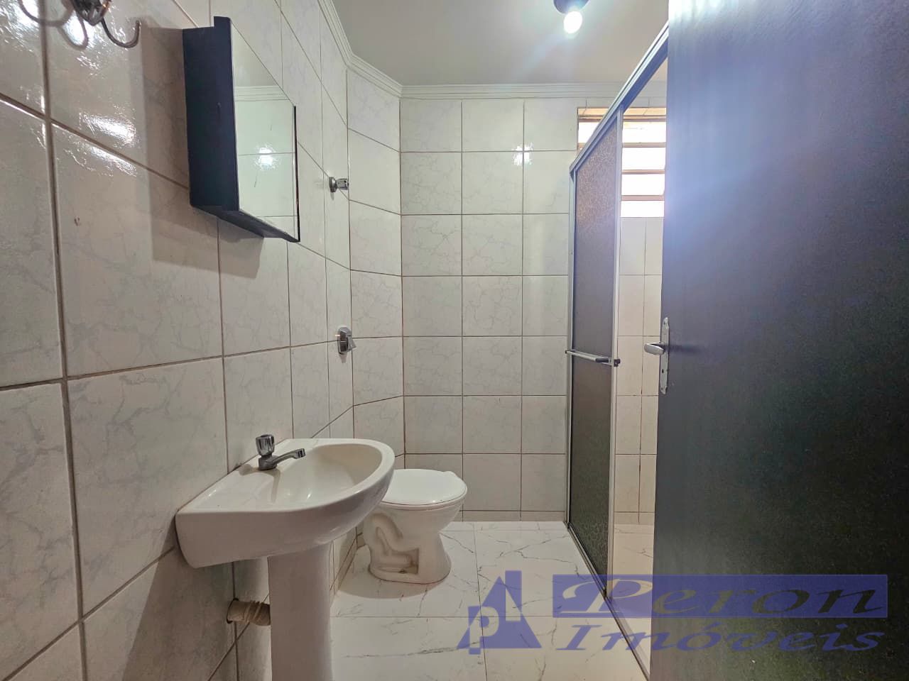 - Banheiro com box, sanitário com tampa, pia, espelho e suportes